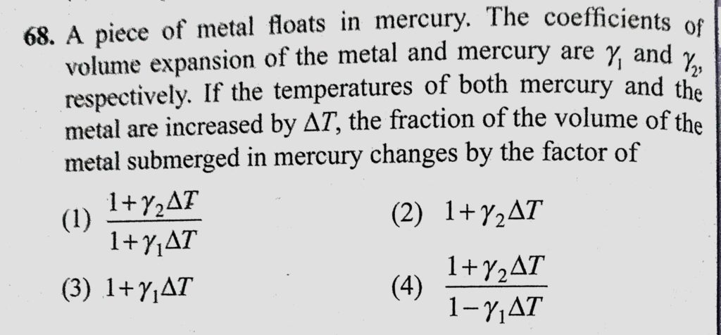 A piece of metal floats in mercury. The coefficients of volume expansion of the metal and mercury are lemda 1 and lemda 2, respectively. If the temperatures of both mercury and the metal A piece of metal floats in mercury. The coefficients of volume expansion of the metal and mercury are lemda 1 and lemda 2 respectively. If the temperatures of both mercury and the metal October 24, 2020 Category: Uncategorised (JEE Advanced Physics by BM Sharma + GMP Solutions) , Facebook Messenger WhatsApp Share this:TwitterFacebook Related