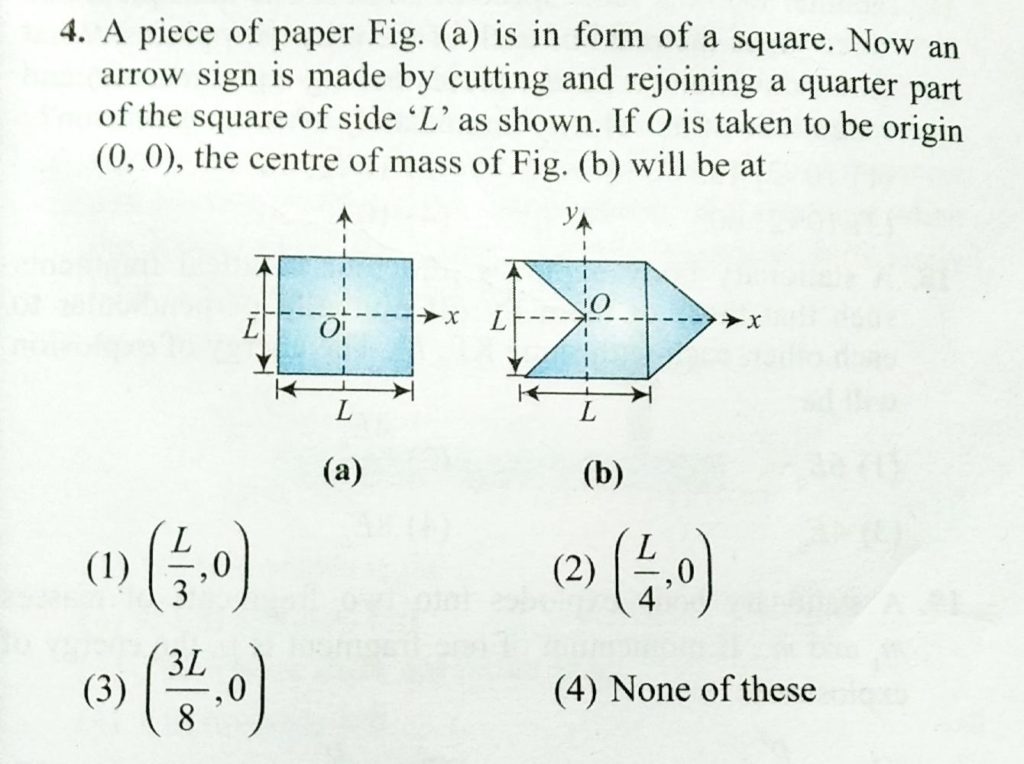 A piece of paper fig. a is in form of a square. now an arrow sign is made by cutting and rejoining a quater part of the square of side L as shown. If O is taken to be origin ( 0,0 ) , the centre of mass of fig. (b) will be at 0 ) A piece of paper fig. a is in form of a square. now an arrow sign is made by cutting and rejoining a quater part of the square of side L as shown. If O is taken to be origin ( 0 the centre of mass of fig. (b) will be at September 20, 2020 Category: Uncategorised (JEE Advanced Physics by BM Sharma + GMP Solutions) , Facebook Messenger WhatsApp Share this:TwitterFacebook Related