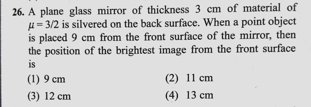 A plane glass mirror of thickness 3 cm of material of mu = 3/2 is silvered on the back surface. When a point object is placed 9 cm from surface of the mirror, then the position of the brightest A plane glass mirror of thickness 3 cm of material of mu = 3/2 is silvered on the back surface. When a point object is placed 9 cm from surface of the mirror then the position of the brightest October 6, 2020 Category: Uncategorised (JEE Advanced Physics by BM Sharma + GMP Solutions) , Facebook Messenger WhatsApp Share this:TwitterFacebook Related