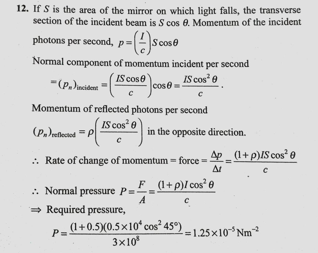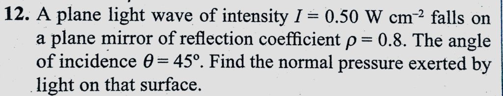 A plane light wave of intensity I = 0.50 W/sm^2 falls on a plane mirror of reflection coefficient rho = 0.8. The angle of incidence theta = 45. Find the normal pressure exerted by light A plane light wave of intensity I = 0.50 W/sm^2 falls on a plane mirror of reflection coefficient rho = 0.8. The angle of incidence theta = 45. Find the normal pressure exerted by light October 12, 2020 Category: Uncategorised (JEE Advanced Physics by BM Sharma + GMP Solutions) , Facebook Messenger WhatsApp Share this:TwitterFacebook Related
