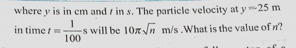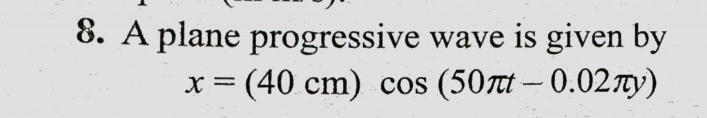 A plane progressive wave is given by x = (40 cm) cos (50 pie t – 0.02 pie y) where y is in cm and t in s. The particle velocity at y = 25 m in time t = 1/100 s will be 10 pie root n m/s. A plane progressive wave is given by x = (40 cm) cos (50 pie t - 0.02 pie y) where y is in cm and t in s. The particle velocity at y = 25 m in time t = 1/100 s will be 10 pie root n m/s. November 5, 2020 Category: Uncategorised (JEE Advanced Physics by BM Sharma + GMP Solutions) , Facebook Messenger WhatsApp Share this:TwitterFacebook Related