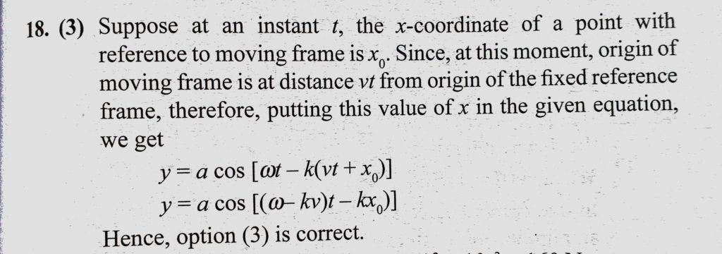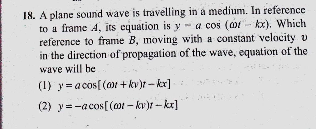 A plane sound wave is travelling in a medium. In reference to a frame A, its equation is y = a cos (omega t – kx). Which reference to frame B, moving with a constant velocity v in the A plane sound wave is travelling in a medium. In reference to a frame A its equation is y = a cos (omega t - kx). Which reference to frame B moving with a constant velocity v in the November 1, 2020 Category: Uncategorised (JEE Advanced Physics by BM Sharma + GMP Solutions) , Facebook Messenger WhatsApp Share this:TwitterFacebook Related