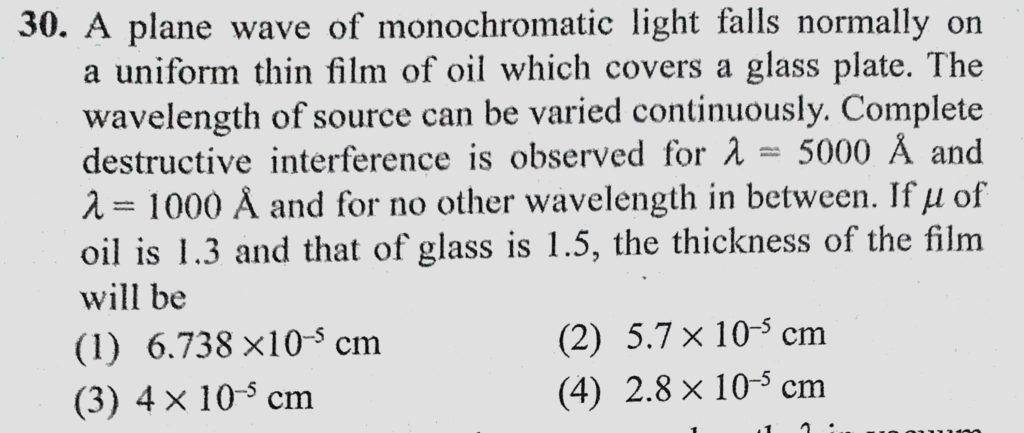 A plane wave of monochromatic light falls normally on a uniform thin film of oil which covers a glass plate. The wavelength of source can be varied continuously. Complete destructive A plane wave of monochromatic light falls normally on a uniform thin film of oil which covers a glass plate. The wavelength of source can be varied continuously. Complete destructive October 10, 2020 Category: Uncategorised (JEE Advanced Physics by BM Sharma + GMP Solutions) , Facebook Messenger WhatsApp Share this:TwitterFacebook Related