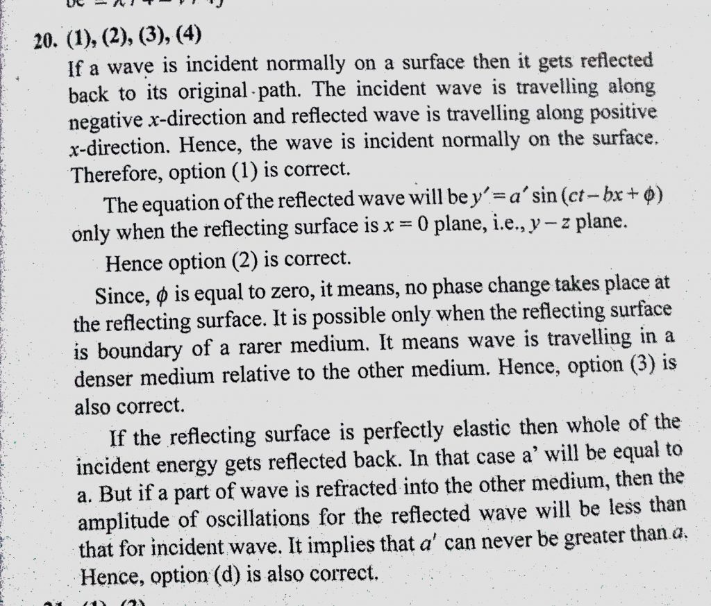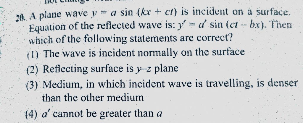 A plane wave y = a sin (kx + ct) is incident on a surface. Equation of the reflected wave is : y’ = a’ sin (ct – bx). Then which of the following statements are correct ? A plane wave y = a sin (kx + ct) is incident on a surface. Equation of the reflected wave is : y' = a' sin (ct - bx). Then which of the following statements are correct ? November 6, 2020 Category: Uncategorised (JEE Advanced Physics by BM Sharma + GMP Solutions) , Facebook Messenger WhatsApp Share this:TwitterFacebook Related
