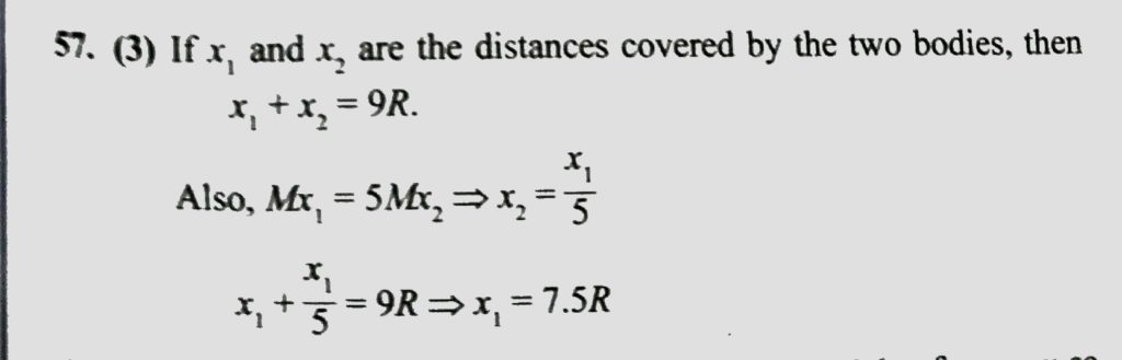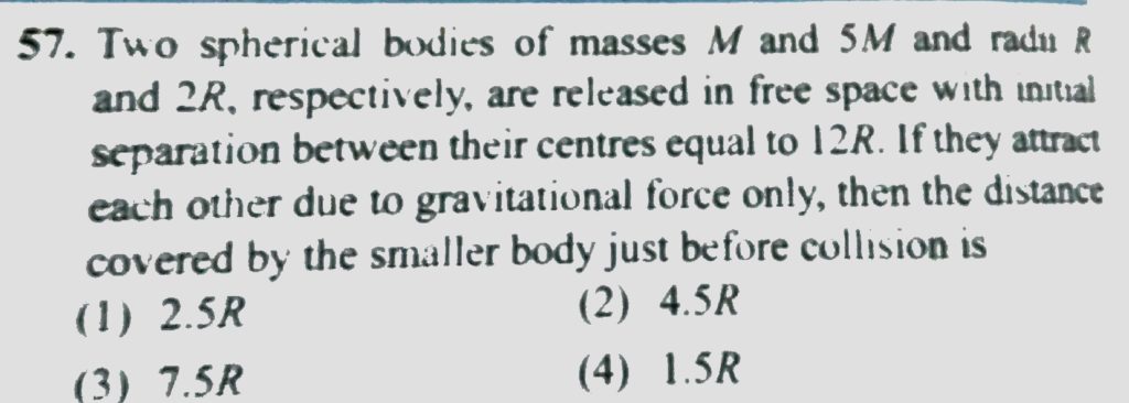 Two spherical bodies of mass M and 5 M & radii R & 2 R respectively are released in free space with initial separation between their centres equal to 12R. If they attract each other due to gravitational force only, then the distance covered by the smallar body just before collision is