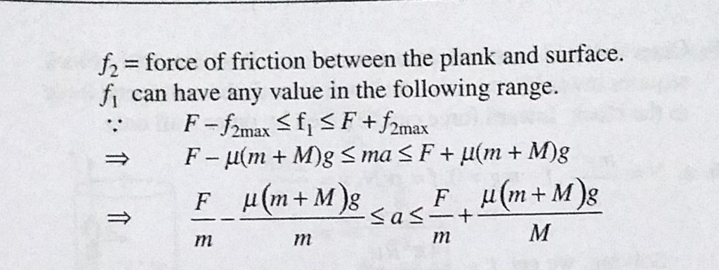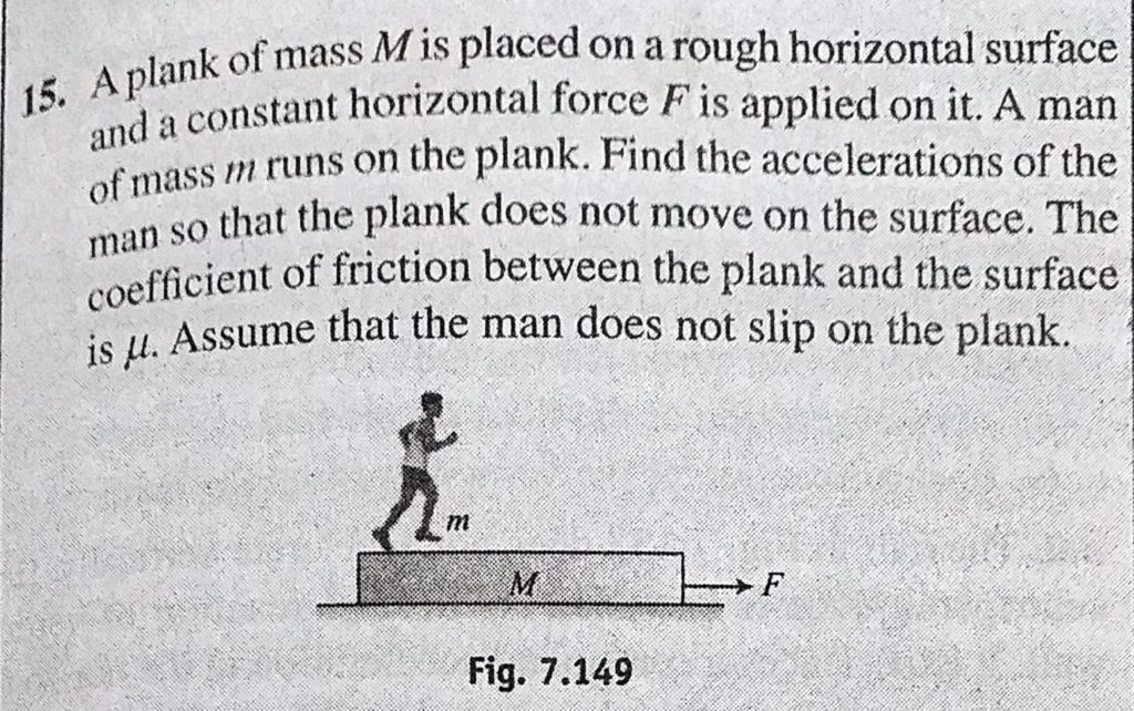 A plank of mass M is placed on a rough horizontal surface and a constant horizontal force F is applied on it. A man of mass m runs on the plank. Find the accelerations of the man so that A plank of mass M is placed on a rough horizontal surface and a constant horizontal force F is applied on it. A man of mass m runs on the plank. Find the accelerations of the man so that September 30, 2020 Category: Uncategorised (JEE Advanced Physics by BM Sharma + GMP Solutions) , Facebook Messenger WhatsApp Share this:TwitterFacebook Related