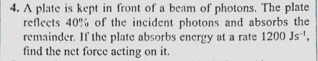 A plate is kept in front of a beam of photons. The plate reflects 40% of the incident photons and absorbs the remainder. If the plate absorb energy at a rate 1200 J/s, find the net force A plate is kept in front of a beam of photons. The plate reflects 40% of the incident photons and absorbs the remainder. If the plate absorb energy at a rate 1200 J/s find the net force October 12, 2020 Category: Uncategorised (JEE Advanced Physics by BM Sharma + GMP Solutions) , Facebook Messenger WhatsApp Share this:TwitterFacebook Related