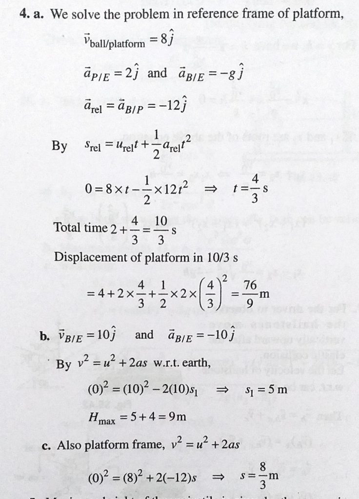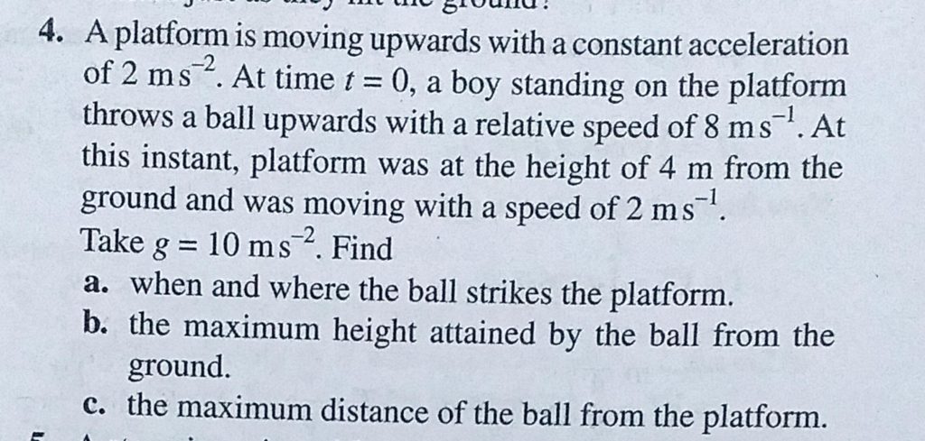 A platform is moving upwards with a constant acceleration of 2 m/s^2. At time t = 0, a boy standing on the platform throws a ball upwards with a relative speed of 8 m/s. At this instant, platform was at the height of 4 m from the ground and was moving with a speed of 2 m/s.