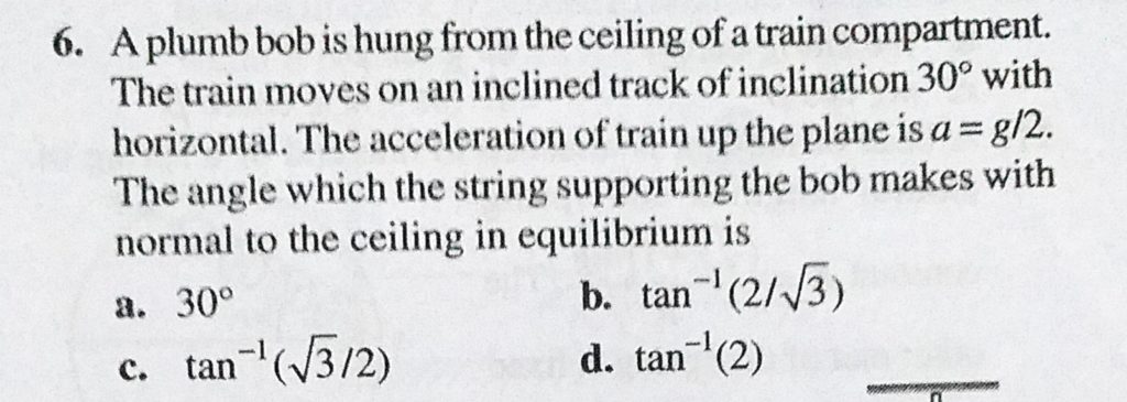 A plumb bob is hung from the ceiling of a train compartment. The train moves on an inclined track of inclination 30 with horizontal. The acceleration of train up the plane is a = g/2. A plumb bob is hung from the ceiling of a train compartment. The train moves on an inclined track of inclination 30 with horizontal. The acceleration of train up the plane is a = g/2. September 29, 2020 Category: Uncategorised (JEE Advanced Physics by BM Sharma + GMP Solutions) , Facebook Messenger WhatsApp Share this:TwitterFacebook Related