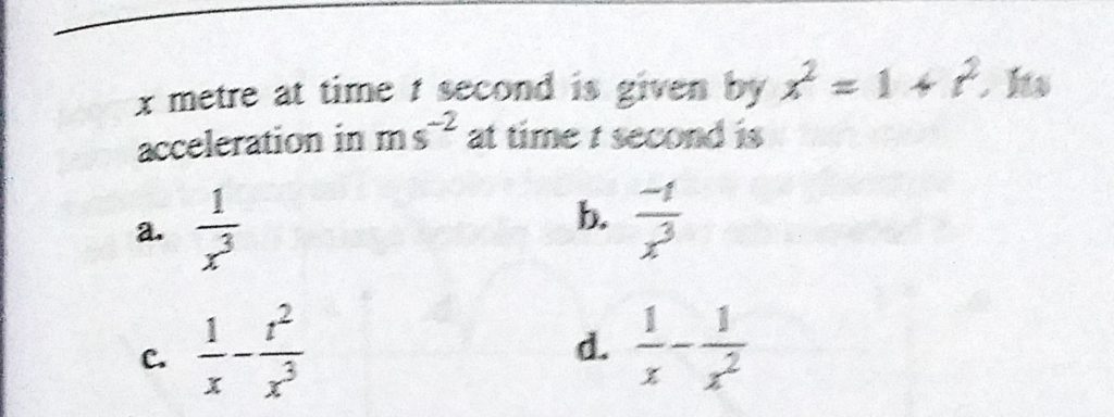 A point moves in a straight line so that its displacement x metre at time t second is given by x^2 = 1 + t^2. Its acceleration in m/s^2 at time t second is A point moves in a straight line so that its displacement x metre at time t second is given by x^2 = 1 + t^2. Its acceleration in m/s^2 at time t second is September 19, 2020 Category: Uncategorised (JEE Advanced Physics by BM Sharma + GMP Solutions) , Facebook Messenger WhatsApp Share this:TwitterFacebook Related