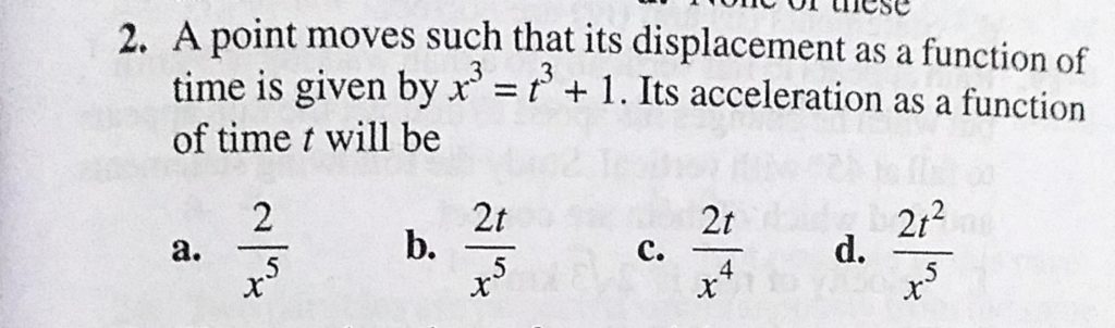 A point moves such that its displacement as a function of time is given by x ^3 = t^3 + 1. Its acceleration as a function of time t will be A point moves such that its displacement as a function of time is given by x ^3 = t^3 + 1. Its acceleration as a function of time t will be September 24, 2020 Category: Uncategorised (JEE Advanced Physics by BM Sharma + GMP Solutions) , Facebook Messenger WhatsApp Share this:TwitterFacebook Related