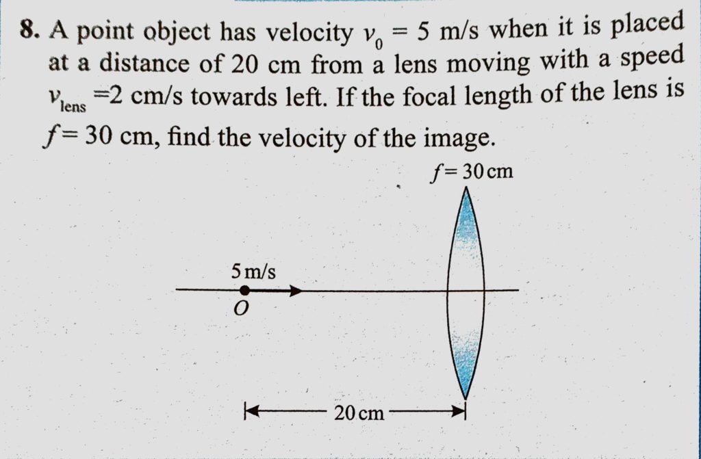 A point object has velocity v0 = 5 m/s when it is placed at a distance of 20 cm from a lens moving with a speed v lens = 2 cm/s towards left. If the focal length of the lens is A point object has velocity v0 = 5 m/s when it is placed at a distance of 20 cm from a lens moving with a speed v lens = 2 cm/s towards left. If the focal length of the lens is October 8, 2020 Category: Uncategorised (JEE Advanced Physics by BM Sharma + GMP Solutions) , Facebook Messenger WhatsApp Share this:TwitterFacebook Related