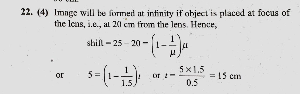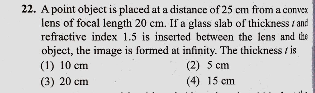A point object is placed at a distance of 25 cm from a convex lens of focal length 20 cm. If a glass slab of thickness t and refractive index 1.5 is inserted between the lens and the A point object is placed at a distance of 25 cm from a convex lens of focal length 20 cm. If a glass slab of thickness t and refractive index 1.5 is inserted between the lens and the October 8, 2020 Category: Uncategorised (JEE Advanced Physics by BM Sharma + GMP Solutions) , Facebook Messenger WhatsApp Share this:TwitterFacebook Related