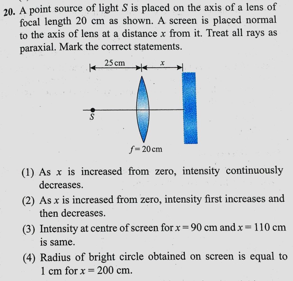 A point source of light S is placed on the axis of a lens of focal length 20 cm as shown. A screen is placed normal to the axis of lens at a distance x from it. Treat all rays as paraxial. A point source of light S is placed on the axis of a lens of focal length 20 cm as shown. A screen is placed normal to the axis of lens at a distance x from it. Treat all rays as paraxial. October 9, 2020 Category: Uncategorised (JEE Advanced Physics by BM Sharma + GMP Solutions) , Facebook Messenger WhatsApp Share this:TwitterFacebook Related