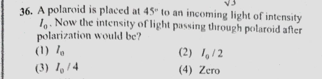 A polaroid is placed at 45 to an incoming light of intensity I0. Now the intensity of light passing through polaroid after polarization would be ? A polaroid is placed at 45 to an incoming light of intensity I0. Now the intensity of light passing through polaroid after polarization would be ? October 12, 2020 Category: Uncategorised (JEE Advanced Physics by BM Sharma + GMP Solutions) , Facebook Messenger WhatsApp Share this:TwitterFacebook Related