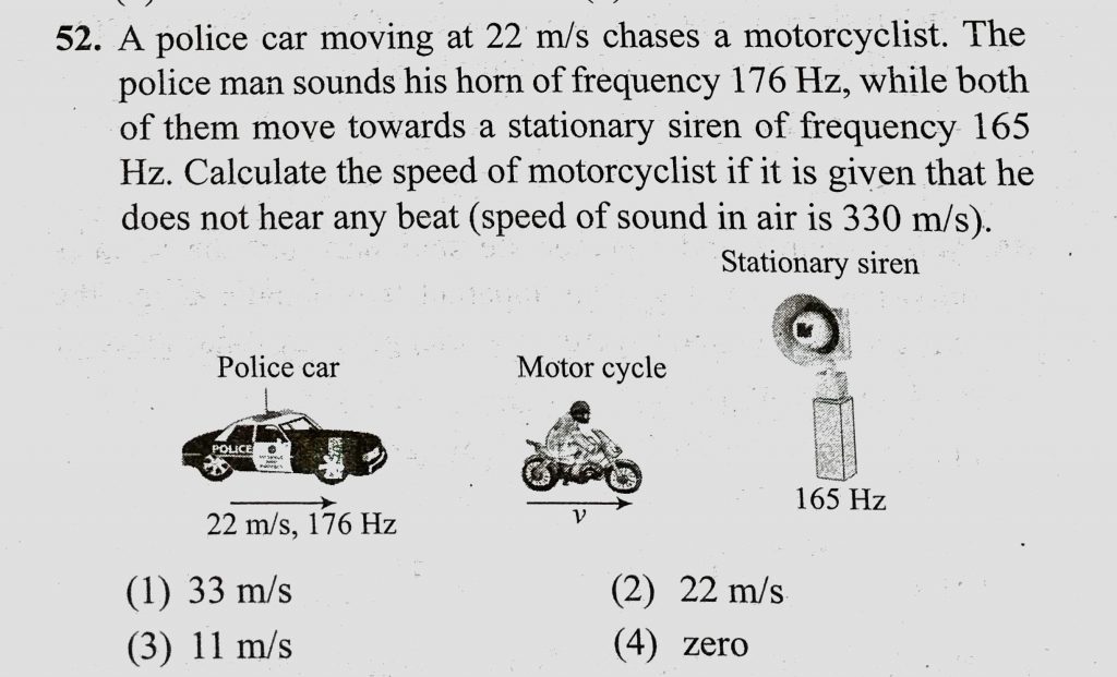 A police car moving at 22 m/s chases a motorcyclist. The policeman sounds his horn of frequency 176 Hz, while both of them move towards a stationary siren of frequency 164 Hz. A police car moving at 22 m/s chases a motorcyclist. The policeman sounds his horn of frequency 176 Hz while both of them move towards a stationary siren of frequency 164 Hz. November 7, 2020 Category: Uncategorised (JEE Advanced Physics by BM Sharma + GMP Solutions) , Facebook Messenger WhatsApp Share this:TwitterFacebook Related