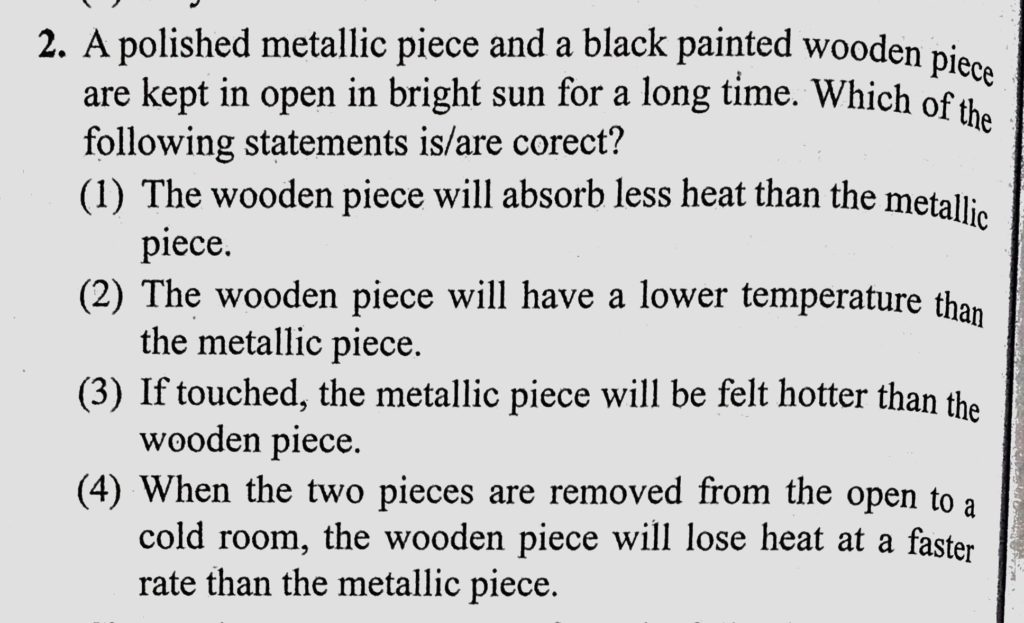 A polished metallic piece and a black painted wooden piece are kept in open in bright sun for a long time. Which of the following statements is/are correct ? A polished metallic piece and a black painted wooden piece are kept in open in bright sun for a long time. Which of the following statements is/are correct ? October 25, 2020 Category: Uncategorised (JEE Advanced Physics by BM Sharma + GMP Solutions) , Facebook Messenger WhatsApp Share this:TwitterFacebook Related