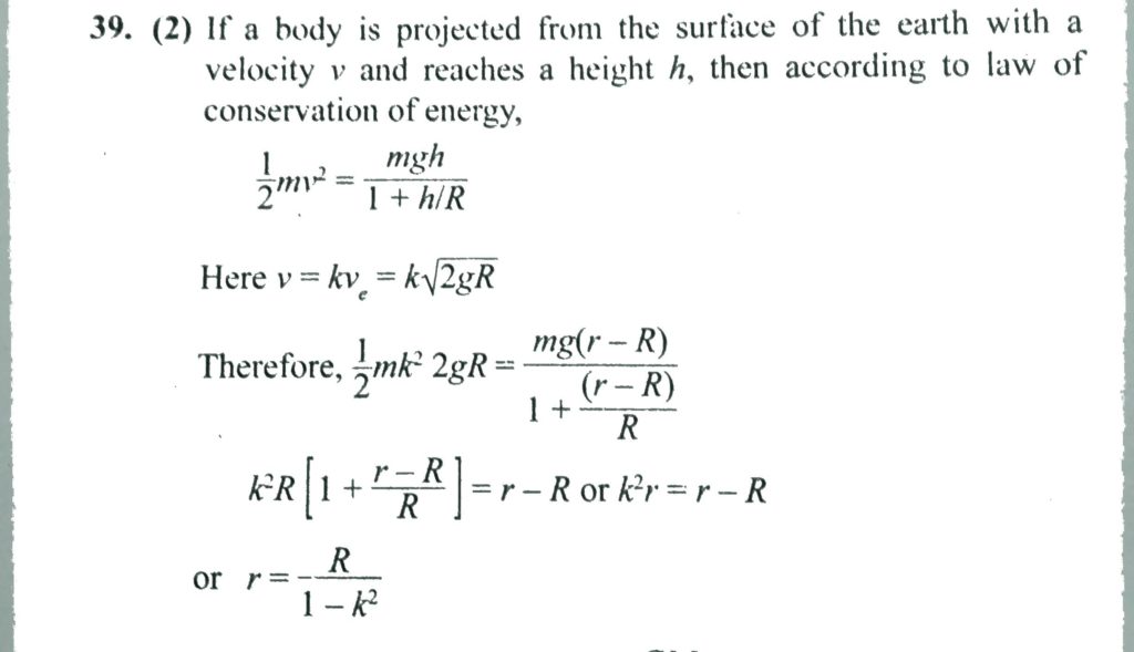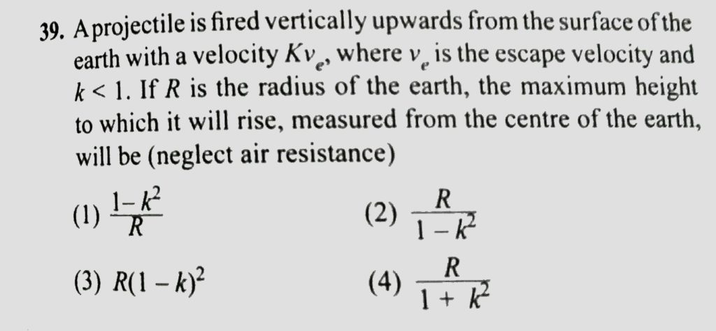 A projectile is fired vertically upwards from the surface of the earth with a velocity kv e where v e is the escape velocity and k<1. If R is the radius of the earth, the maximum height to which it will rise measured from the centre of earth will be (neglect air resistance)