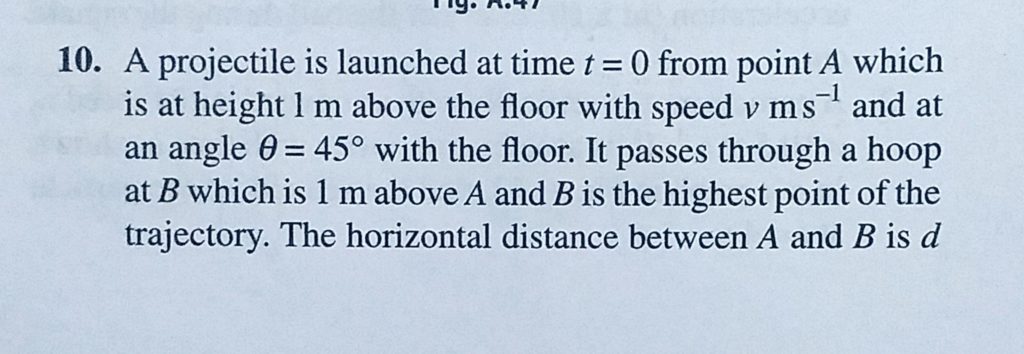 A projectile is launched at time t = 0 from point A which is at height 1 m above the floor with speed v m/s and at an angle theta = 45 with the floor. It passes through a hoop at B A projectile is launched at time t = 0 from point A which is at height 1 m above the floor with speed v m/s and at an angle theta = 45 with the floor. It passes through a hoop at B September 25, 2020 Category: Uncategorised (JEE Advanced Physics by BM Sharma + GMP Solutions) , Facebook Messenger WhatsApp Share this:TwitterFacebook Related