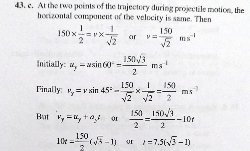 A projectile is thrown in the upward direction making an angle of 60 with the horizontal direction with a velocity of 150 m/s. Then the time after which its inclination with the horizontal is 45 is A projectile is thrown in the upward direction making an angle of 60 with the horizontal direction with a velocity of 150 m/s. Then the time after which its inclination with the horizontal is 45 is September 22, 2020 Category: Uncategorised (JEE Advanced Physics by BM Sharma + GMP Solutions) , Facebook Messenger WhatsApp Share this:TwitterFacebook Related