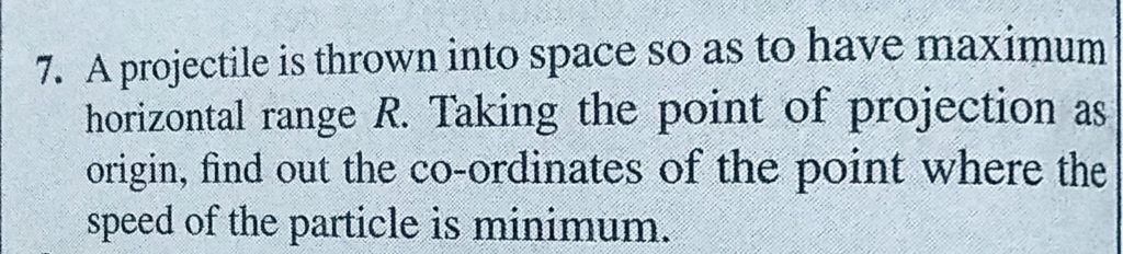 A projectile is thrown into space so as to have maximum horizontal range R. Taking the point of projection as origin, find out the co-ordinates of the point where the speed of the particle is minimum. A projectile is thrown into space so as to have maximum horizontal range R. Taking the point of projection as origin find out the co-ordinates of the point where the speed of the particle is minimum. September 19, 2020 Category: Uncategorised (JEE Advanced Physics by BM Sharma + GMP Solutions) , Facebook Messenger WhatsApp Share this:TwitterFacebook Related