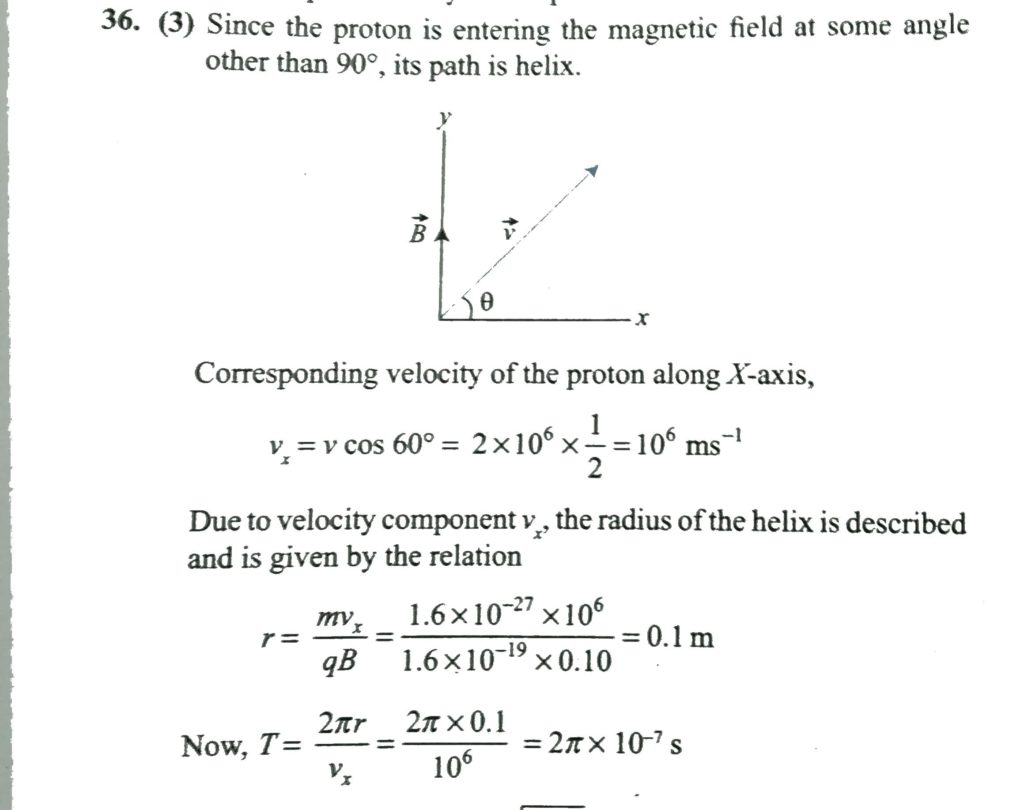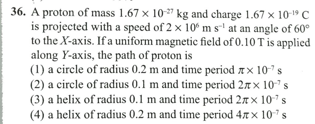 A proton of mass 1.67 x 10^ -27 kg and charge 1.67 x 10^-19 C is projected with a speed of 2 x 10^6 m/s at an angle of 60 degree to the X – axis. If a uniform magnetic field of 0.10 T is applied along Y – axis , the path of proton is A charged particle moving along positive x-direction with a velocity v enters a region where there is a uniform magnetic field B =−B k ^ from x=0 to x=d.The particle gets deflected at an angle θ from its initial path.The specific charge of the particle is October 13, 2020 Category: Uncategorised (JEE Advanced Physics by BM Sharma + GMP Solutions) , Facebook Messenger WhatsApp Share this:TwitterFacebook Related