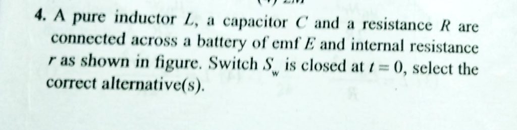 A pure conductor L, a capacitor C and a resistance R are connected across a battery of emf E and internal resistance r as shown in figure. switch Sw is closed at t = 0 , select the correct alternatives. a capacitor C and a resistance R are connected across a battery of emf E and internal resistance r as shown in figure. switch Sw is closed at t = 0 A pure conductor L select the correct alternatives. October 22, 2020 Category: Uncategorised (JEE Advanced Physics by BM Sharma + GMP Solutions) , Facebook Messenger WhatsApp Share this:TwitterFacebook Related
