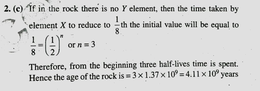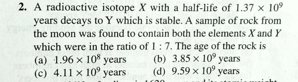 A radioactive isotope X with a half life of 1.37 x 10^9 years decays to Y which is stable. A sample of rock from the moon was found to contain both the element X and Y which were in the ratio of 1 : 7. The age of the rock is Three alpha particles and one beta particles decaying takes place in series from isotope 88 R 238. Finally the isotope obtained will be September 14, 2020 Category: Uncategorised (JEE Advanced Physics by BM Sharma + GMP Solutions) , Facebook Messenger WhatsApp Share this:TwitterFacebook Related