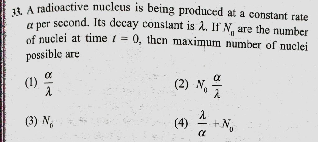 A radioactive nucleus is being produced at a constant rate alpha per second. Its decay constant is lemda. If N0 are the number of nuclei at time t =0, then maximum number of nuclei possible are A radioactive nucleus is being produced at a constant rate alpha per second. Its decay constant is lemda. If N0 are the number of nuclei at time t =0 then maximum number of nuclei possible are October 17, 2020 Category: Uncategorised (JEE Advanced Physics by BM Sharma + GMP Solutions) , Facebook Messenger WhatsApp Share this:TwitterFacebook Related
