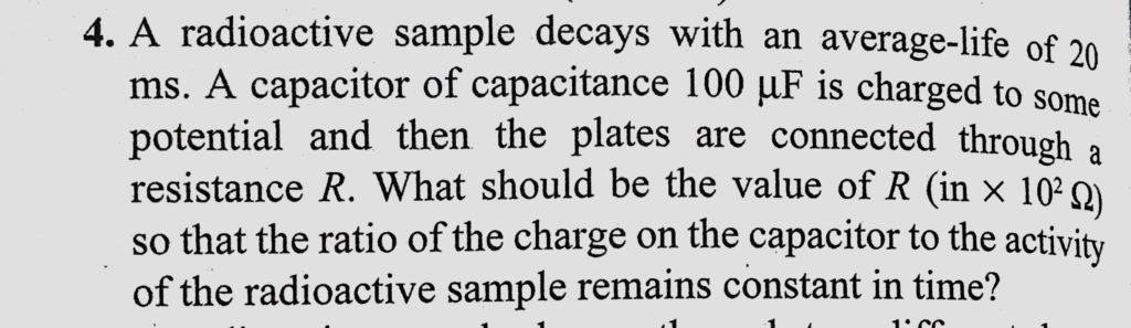 A radioactive sample decays with an average-life of 20 ms. A capacitor of capacitance 100 micro F i charged to some potential and then the plates are connected through a resistance R. A radioactive sample decays with an average-life of 20 ms. A capacitor of capacitance 100 micro F i charged to some potential and then the plates are connected through a resistance R. October 20, 2020 Category: Uncategorised (JEE Advanced Physics by BM Sharma + GMP Solutions) , Facebook Messenger WhatsApp Share this:TwitterFacebook Related