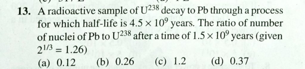 A radioactive sample of ^(238)U decay to Pb through a process for which the half is 4.5 × 10^9 year. Find the ratio of number of nuclei of Pb to ^(238) U after a time of 1.5 × 10^9 year Given (2)1/3 = 1.26 Excitation energy of a hydrogen like ion in its first excitation state is 40.8 eV. Energy needed to remove the electron from the ion in ground state is September 14, 2020 Category: Uncategorised (JEE Advanced Physics by BM Sharma + GMP Solutions) , Facebook Messenger WhatsApp Share this:TwitterFacebook Related