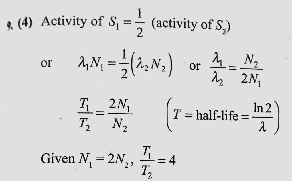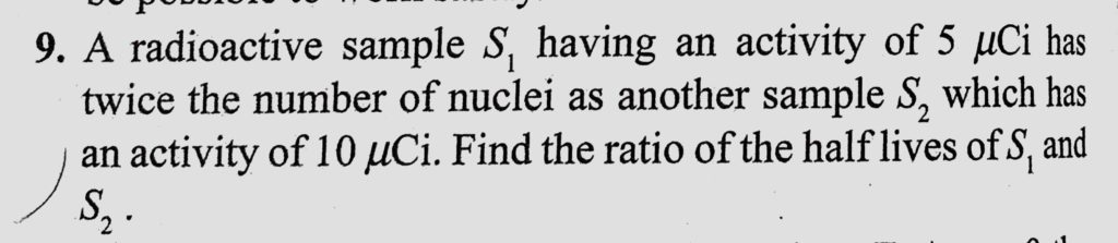 A radioactive sample S1 having an activity of 5 muCi has twice the number of nuclei as another sample S2 which has an activity of 10 muCi. Find the ratio of the half lives of S1 and S2. A radioactive sample S1 having an activity of 5 muCi has twice the number of nuclei as another sample S2 which has an activity of 10 muCi. Find the ratio of the half lives of S1 and S2. October 20, 2020 Category: Uncategorised (JEE Advanced Physics by BM Sharma + GMP Solutions) , Facebook Messenger WhatsApp Share this:TwitterFacebook Related
