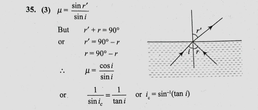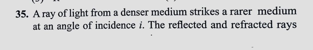 A ray of light from a denser medium strikes a rarer medium at an angle of incidence i. The reflected and refracted rays make an angle of pie/2 with each other. If the angles fo A ray of light from a denser medium strikes a rarer medium at an angle of incidence i. The reflected and refracted rays make an angle of pie/2 with each other. If the angles fo October 6, 2020 Category: Uncategorised (JEE Advanced Physics by BM Sharma + GMP Solutions) , Facebook Messenger WhatsApp Share this:TwitterFacebook Related