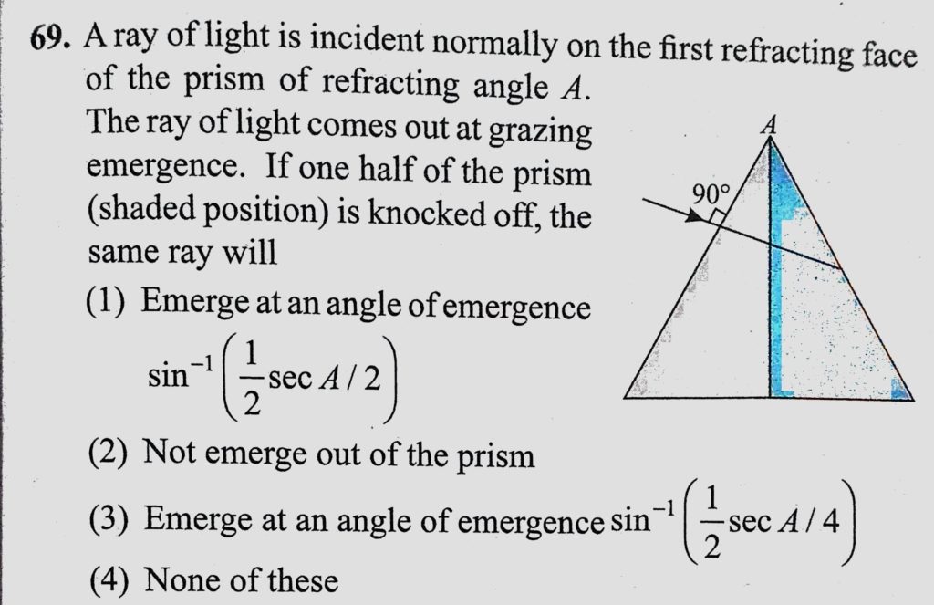 A ray of light is incident normally on the first refracting face of the prism of refracting angle A. The ray of light comes out at grazing emergence. If one half of the prism is knocked off, A ray of light is incident normally on the first refracting face of the prism of refracting angle A. The ray of light comes out at grazing emergence. If one half of the prism is knocked off October 6, 2020 Category: Uncategorised (JEE Advanced Physics by BM Sharma + GMP Solutions) , Facebook Messenger WhatsApp Share this:TwitterFacebook Related