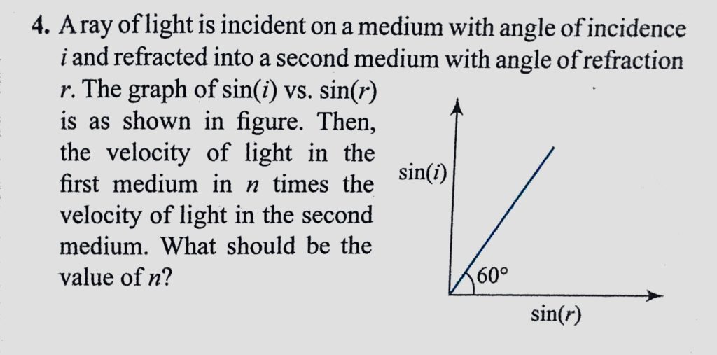 A ray of light is incident on a medium with angle of incidence i and refracted into a second medium with angle of refraction r. The graph of sin(i) vs. sin(r) is as shown in figure. Then the velocity A ray of light is incident on a medium with angle of incidence i and refracted into a second medium with angle of refraction r. The graph of sin(i) vs. sin(r) is as shown in figure. Then the velocity October 6, 2020 Category: Uncategorised (JEE Advanced Physics by BM Sharma + GMP Solutions) , Facebook Messenger WhatsApp Share this:TwitterFacebook Related