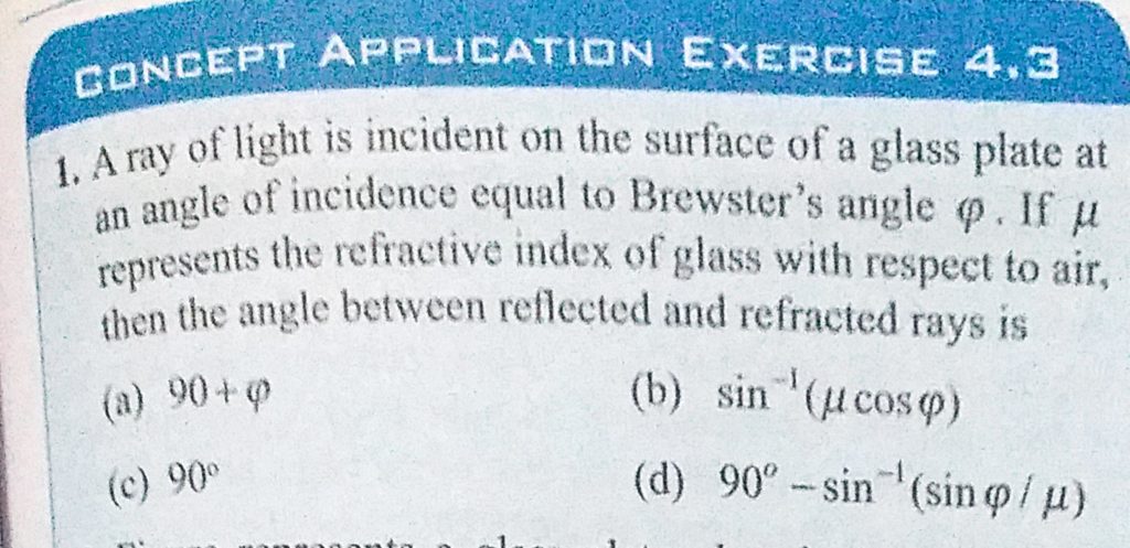 A ray of light is incident on the surface of a glass plate at an angle of incidence equal to Brewster’s angle phi. If mu represents the refractive index of glass with respect to air, A ray of light is incident on the surface of a glass plate at an angle of incidence equal to Brewster's angle phi. If mu represents the refractive index of glass with respect to air October 11, 2020 Category: Uncategorised (JEE Advanced Physics by BM Sharma + GMP Solutions) , Facebook Messenger WhatsApp Share this:TwitterFacebook Related