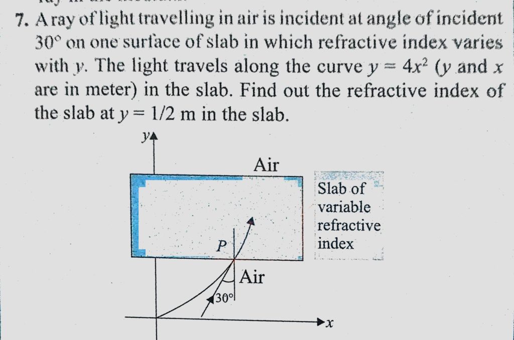 A ray of light travelling in air is incident at angle of incident 30 on one surface of slab in which refractive index varies with y. The light travels along the curve y = 4 x^2 (Y and X are in meter) in the slab. A concave mirror of radius R is kept on a horizontal table. Water (refractive index = mu) is poured into it up to a height h. Where should an object be placed so that its image is formed on itself? October 5, 2020 Category: Uncategorised (JEE Advanced Physics by BM Sharma + GMP Solutions) , Facebook Messenger WhatsApp Share this:TwitterFacebook Related