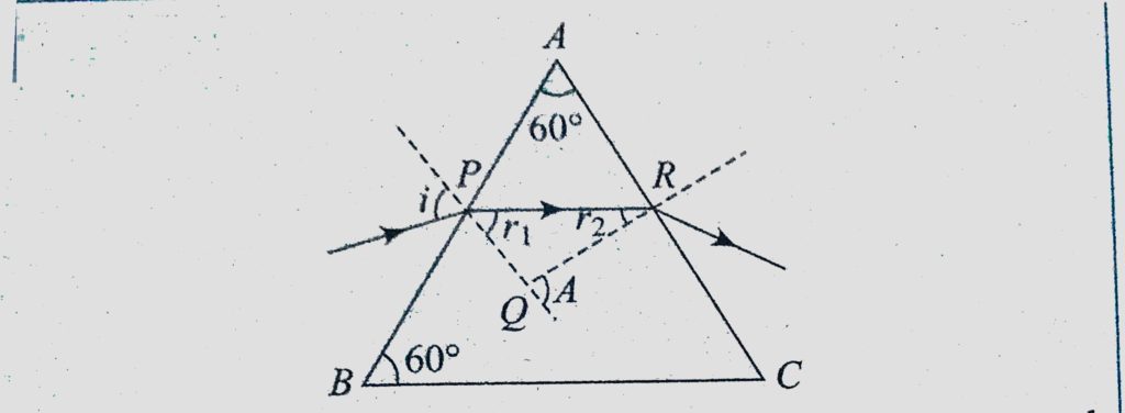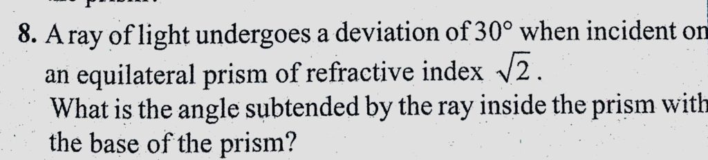 A ray of light undergoes a deviation of 30 when incident on an equilateral prism of refractive index root 2. What is the angle subtended by the ray inside the prism with the base of the prism? A ray of light undergoes a deviation of 30 when incident on an equilateral prism of refractive index root 2. What is the angle subtended by the ray inside the prism with the base of the prism? October 5, 2020 Category: Uncategorised (JEE Advanced Physics by BM Sharma + GMP Solutions) , Facebook Messenger WhatsApp Share this:TwitterFacebook Related