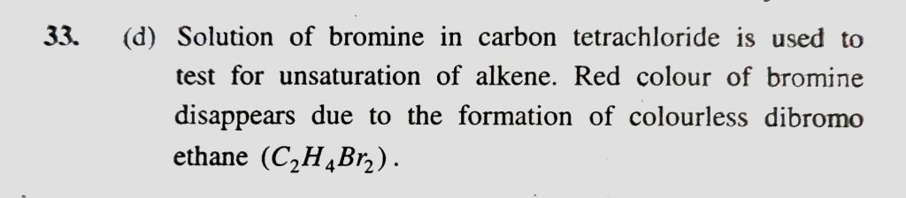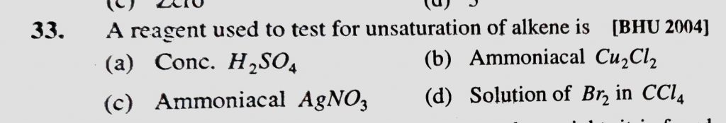 A reagent used to test for unsaturation of alkene is (a) Conc. H2SO4 (b) Ammoniacal Cu2Cl2 (c) Ammonical AgNO3 (d) Solution of Br2 in CCl4 A reagent used to test for unsaturation of alkene is (a) Conc. H2SO4 (b) Ammoniacal Cu2Cl2 (c) Ammonical AgNO3 (d) Solution of Br2 in CCl4 December 13, 2020 Category: Uncategorised (JEE Advanced Physics by BM Sharma + GMP Solutions) , Facebook Messenger WhatsApp Share this:TwitterFacebook Related