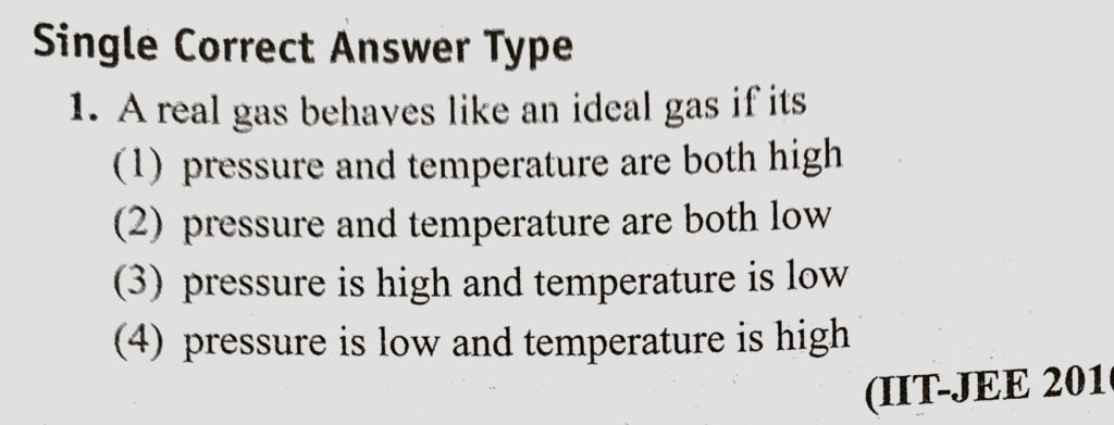 A real gas behaves like an ideal gas if its (1) pressure and temperature are both high (2) Pressure and temperature are both low A real gas behaves like an ideal gas if its (1) pressure and temperature are both high (2) Pressure and temperature are both low October 28, 2020 Category: Uncategorised (JEE Advanced Physics by BM Sharma + GMP Solutions) , Facebook Messenger WhatsApp Share this:TwitterFacebook Related