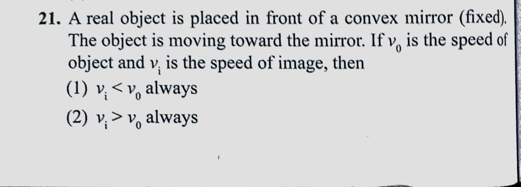 A real object is placed in front of a convex mirror (fixed). The object is moving toward the mirror. If v0 is the speed of object and vi is the speed of image then, A real object is placed in front of a convex mirror (fixed). The object is moving toward the mirror. If v0 is the speed of object and vi is the speed of image then October 6, 2020 Category: Uncategorised (JEE Advanced Physics by BM Sharma + GMP Solutions) , Facebook Messenger WhatsApp Share this:TwitterFacebook Related