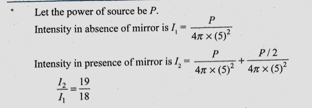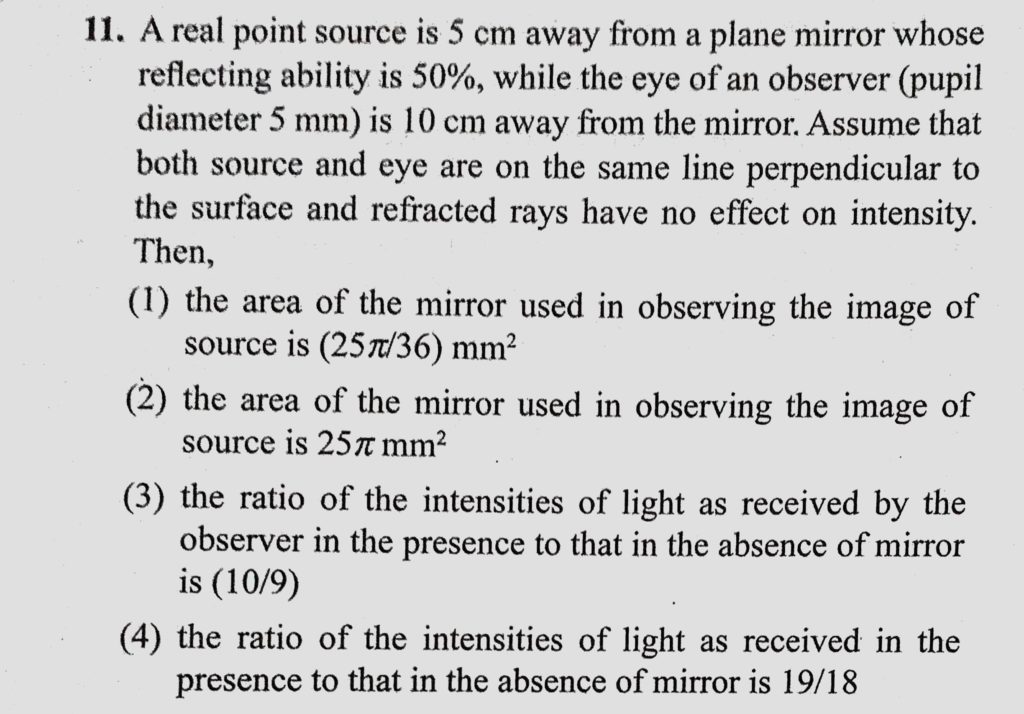 A real point source is 5 cm away from a plane mirror whose reflecting ability is 50% ,while the eye of an observer (pupil diameter 5 mm) is 10 cm away from mirror. Assume that A real point source is 5 cm away from a plane mirror whose reflecting ability is 50% while the eye of an observer (pupil diameter 5 mm) is 10 cm away from mirror. Assume that October 6, 2020 Category: Uncategorised (JEE Advanced Physics by BM Sharma + GMP Solutions) , Facebook Messenger WhatsApp Share this:TwitterFacebook Related