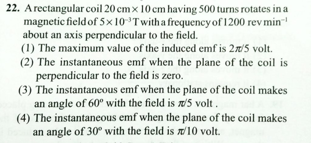 A rectangular coil 20 cm×10 cm having 500 turns rotates in a magnetic field of 5 × 10^−3 T with a frequency of 1200 rev/min about an axis perpendicular to the field. A rectangular coil 20 cm×10 cm having 500 turns rotates in a magnetic field of 5 × 10^−3 T with a frequency of 1200 rev/min about an axis perpendicular to the field. October 21, 2020 Category: Uncategorised (JEE Advanced Physics by BM Sharma + GMP Solutions) , Facebook Messenger WhatsApp Share this:TwitterFacebook Related