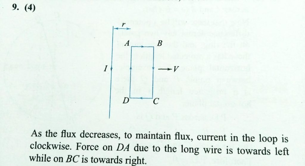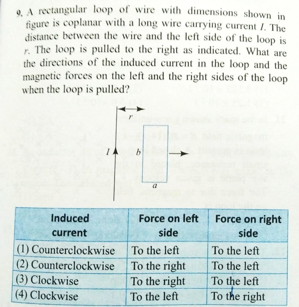 A rectangular loop of wire with dimensions shown in figure is coplanar with a long wire carrying current ‘I’. The distance between the wire and the left side of the loop is r. The loop is pulled to the right as indicated. What are the directions of the induced current in the loop and the magnetic forces on the left and right sides of the loop when the loop is pulled ?