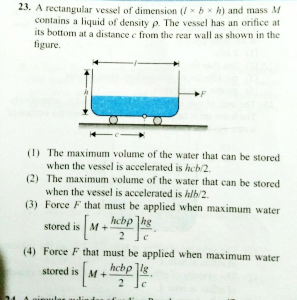 A rectangular vessel of dimension ( l x b x h ) and mass M contains a liquid of density rho. The vessel has an orifice at its bottom at a distance c from the rear wall as shown in the figure. A rectangular vessel of dimension ( l x b x h ) and mass M contains a liquid of density rho. The vessel has an orifice at its bottom at a distance c from the rear wall as shown in the figure. October 8, 2020 Category: Uncategorised (JEE Advanced Physics by BM Sharma + GMP Solutions) , Facebook Messenger WhatsApp Share this:TwitterFacebook Related