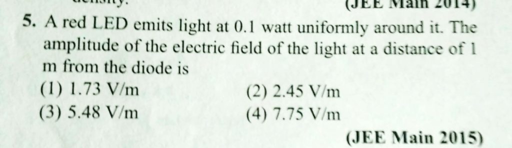 A red LED emits light at 0.1 watt uniformly around it. The amplitude of the electric field of the light at a distance of 1 m from the diode is A red LED emits light at 0.1 watt uniformly around it. The amplitude of the electric field of the light at a distance of 1 m from the diode is October 29, 2020 Category: Uncategorised (JEE Advanced Physics by BM Sharma + GMP Solutions) , Facebook Messenger WhatsApp Share this:TwitterFacebook Related