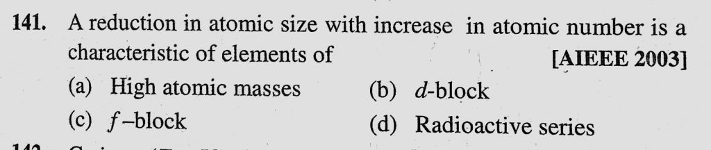 A reduction in atomic size with increase in atomic number is a characteristic of elements of (a) High atomic masses (b) d-block (c) f-block A reduction in atomic size with increase in atomic number is a characteristic of elements of (a) High atomic masses (b) d-block (c) f-block November 30, 2020 Category: Uncategorised (JEE Advanced Physics by BM Sharma + GMP Solutions) , Facebook Messenger WhatsApp Share this:TwitterFacebook Related
