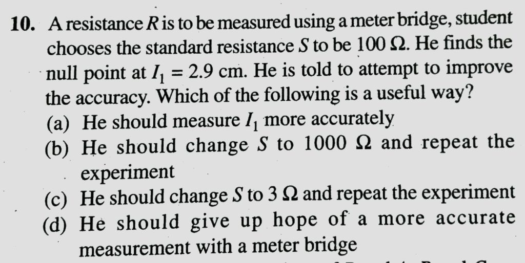 A resistance R is to be measured using a meter bridge. Student chooses the standared resistance S to be 100Ω. He finds the null point at l1=2.9cm. He is told to attempt to improve the accuracy. Which of the folllowing is a useful way? Two cells of emfs approximately 5 V and 10 V are to be accurately compared using a poteniometer of length 400 cm. September 20, 2020 Category: Uncategorised (JEE Advanced Physics by BM Sharma + GMP Solutions) , Facebook Messenger WhatsApp Share this:TwitterFacebook Related