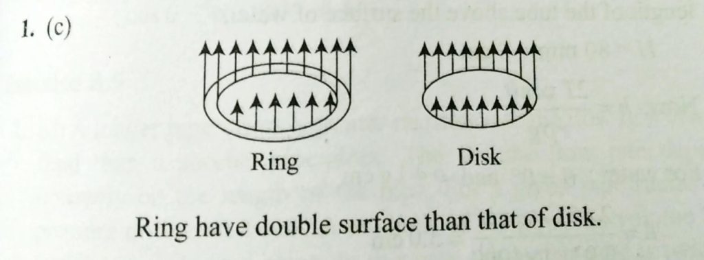 A rigid ring A and a rigid thin disk B both made of same material when gently placed on water just manage to float due to surface tension as shown in the figure. Both the ring and the disk have same radius what can you conclude about their masses? (a). Both habve the same mass. (b). mass of ring is half of that of the disk (c). mass of the ring is double to that of the disk. (d). more information is needed to decide.