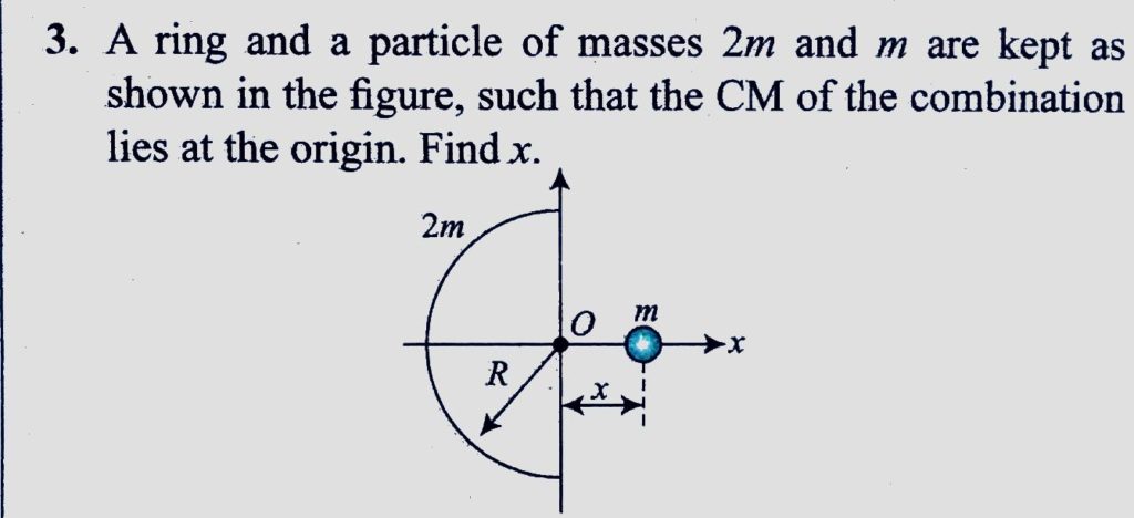 A ring and a particle of masses 2m and m are kept as shown in the figure, such that the CM of the combination lies at the origin. Find x. A ring and a particle of masses 2m and m are kept as shown in the figure such that the CM of the combination lies at the origin. Find x. September 20, 2020 Category: Uncategorised (JEE Advanced Physics by BM Sharma + GMP Solutions) , Facebook Messenger WhatsApp Share this:TwitterFacebook Related